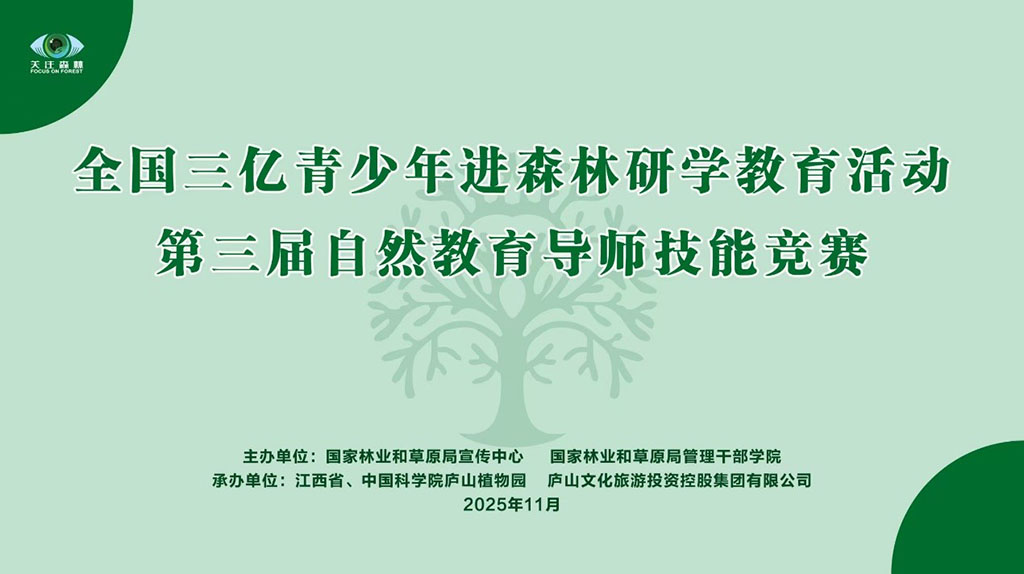 2025年11月5日,由国家林业和草原局宣传中心和国家林业和草原局管理干部学院主办,江西省、中国科学院庐山植物园和庐山文化旅游投资控股集团有限公司承办的全国三亿青少年进森林研学教育活动第三届自然教育导师技能竞赛在庐山植物园圆满落幕。来自全国各自然保护区或自然教育相关单位的43位参赛选手,聚焦自然教育这一主题,从“自然教育项目策划”和“自然教育现场教学”两个部分展开激烈比拼。
