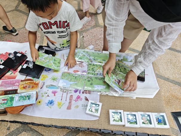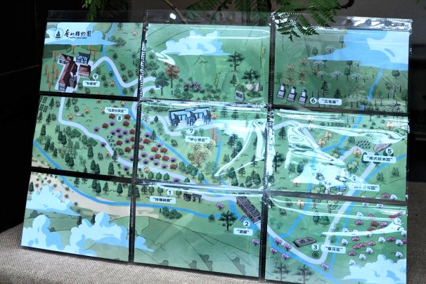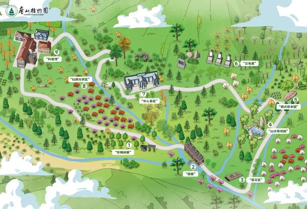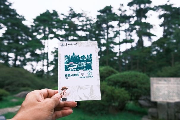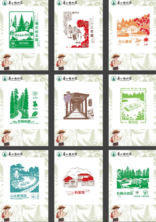 作品兼具创意与实用性——每张卡片背面设计为独立拼图块,集齐九张即可拼成一幅完整的庐山植物园游览地图,九个景点不再是孤立的地标,而是由一条完整的叙事线索串联起来。使集章打卡的过程寓教于乐,融趣味于自然探索之中。