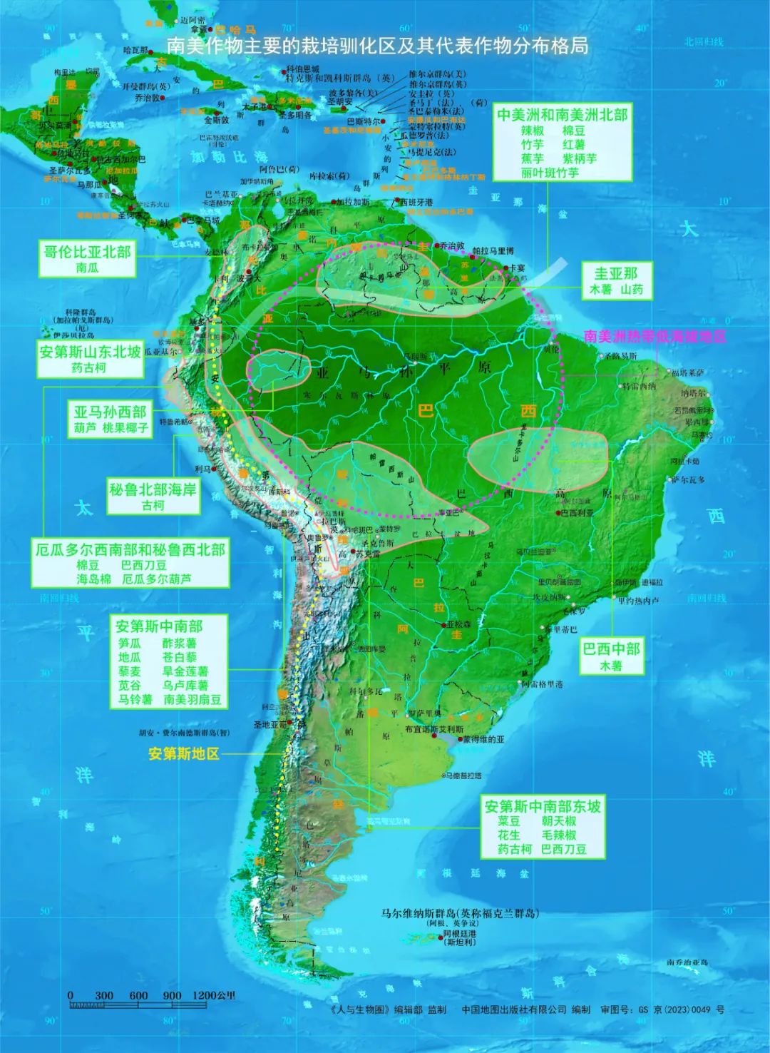 美洲是最晚被现代人类到访并定居的大陆,其原住民是源于西伯利亚的亚洲人后裔,于更新世末期(距今1.7万~1.2万年)通过白令陆桥进入美洲,并经历了在大陆内往返迁移和人口扩张的动态过程。原住民对当地植物的利用、栽培和驯化,一方面解决了人口扩张和迁移的基本食物来源问题,另一方面也改变了南美森林自然景观面貌。在16世纪初欧洲人探索和征服的时代开始之前,南美原住民几乎都从事农业生产活动,有数千年的植物利用历史,对其生活的自然环境有长期而非凡的知识储备。在被欧洲人殖民前,仅亚马逊地区就有约12%的面积因人类活动而改变,有138种植物经历了不同程度的驯化,其中83种是亚马逊当地植物,约68%的种类是乔木或木质化的多年生植物,形成了独特的乔木作物驯化与农耕景观。美洲植物的栽培驯化可追溯到约1万年前,可分为三个相对独立驯化起源类型。北美的驯化植物种类最少,主要有南瓜和向日葵两种,至今仍在全球广泛栽培,另外两种——假苍耳与伯兰德藜则在人类农耕变迁中驯化消失或终止。中美洲的墨西哥是植物驯化的重要中心之一,其玉米的栽培驯化比南瓜稍晚,始于距今9000~8000年的墨西哥中西部巴尔萨盆地,为单一驯化起源的美洲作物;更晚一些的豆类栽培驯化发生在墨西哥及周边不同地区,如菜豆源于墨西哥中部。据记载,原产美洲的作物有60余种,其中包括在中国广泛引种栽培的粮食和饲料作物玉米、红薯、马铃薯和木薯;经济作物烟草、陆地棉、橡胶和剑麻;油料作物花生和向日葵;蔬菜作物番茄、辣椒、南瓜、菜豆(四季豆)、笋瓜和西葫芦;水果作物菠萝、豆薯(凉薯)、番石榴、鳄梨(油梨)、番荔枝、番木瓜和腰果;药材作物金鸡纳、古柯、西洋参(花旗参)、玛卡(秘鲁胡萝卜)和可可;香料作物香荚兰等。