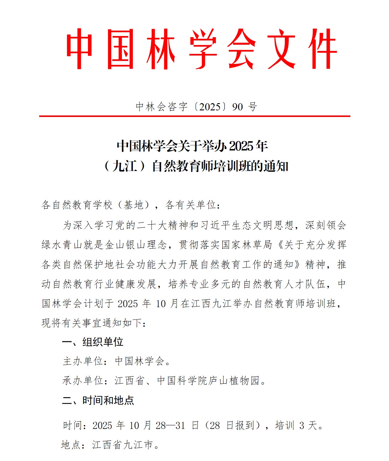 为深入学习党的二十大精神与习近平生态文明思想,贯彻相关通知要求,推动自然教育行业发展,培养专业人才,由中国林学会(主办),江西省、中国科学院庐山植物园(承办)联合,定于2025 年 10 月 28-31 日(28 日报到)在江西九江举办自然教育师培训班。